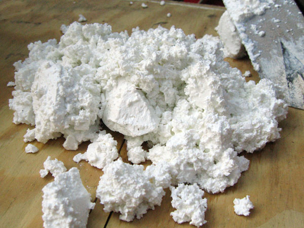 The small particle size and rapid carbonation of the frozen lime result in a putty with wonderful working properties, particularly when stuccoing or plastering. The increased range of particle sizes may be due in part to fracturing of the calcium hydroxide crystals when water in the mix freezes. On the other hand, the considerable amount of energy required to reconstitute the "cottage cheese" into a smooth putty may play an even bigger role. Since the frozen putty is a semi-solid, the energy put into crushing the lumps and shearing the particles against each other leads to an uneven particle size distribution, but also a wonderfully colloidal matrix with excellent working and curing properties... certainly not a material to be discarded.