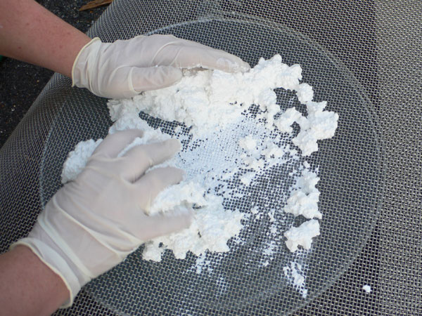 We had repeatedly tried and failed to repeat them in replica mortars. Traditionally lime putty was stored for long periods before use in mortar. If we accept that these putties would have naturally frozen during that time, then it stands to reason masons in the past were faced with chopping and hoeing and even screening to work out these frozen chunks of "cottage cheese" to make a smooth paste for their mortars. So the only way to get blebs to match what we see in historic mortars is to use frozen lime.