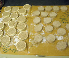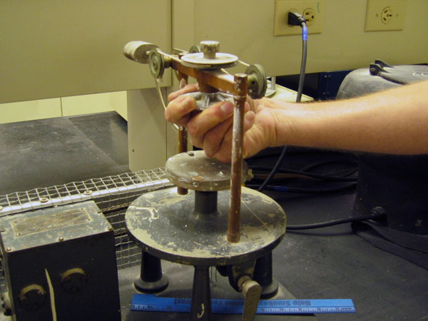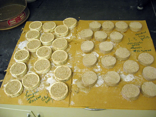 It was interesting to note that the frozen lime mortar samples would not come out of the rings we put them in. Most things shrink slightly when water evaporates, but we had to cut the rings off these samples. The particle size of frozen mortar is such that it holds on to water. It doesn't shrink-- it expands.
