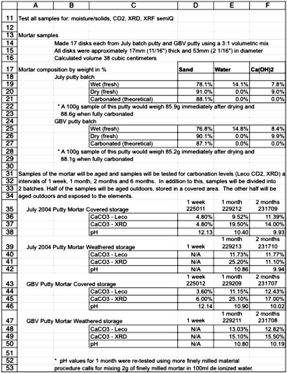 We set batches of frozen and unfrozen mortar outside and inside and let them sit for two months. This chart details the process of the experiment. "July batch putty" refers to the standard lime putty, and "GBV putty" refers to the frozen lime putty.