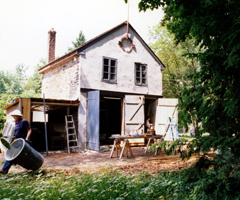 In the year following the main work at Wyck when there was only enough money to take care of windows, stucco, gutters, etc, we hadn't been able to do anything about the primary or kitchen roofs, nor conduct anything but basic stabilization at the Carriage House. When it came time to work on the carriage house, we connected a trailer to the carriage house with roof and walls as a workshop to restore the carriage house doors.