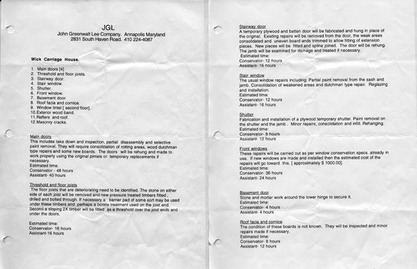 During the main Wyck project we had decided the work would not go out to bid because we didn't think there were contractors with the necessary skills, plus trying to write enough detail in specifications to cover for lack of contractor knowledge would devour all the money and still would be hard to control. Instead we opted to assemble a team of craftspeople — masons, carpenters, apprentices — and have them work under the direction of a conservation management team (Restoration Group) with Architect Charles Phillips and the conservators training and supervising a lot of the workers. As is often the case, even though participation by Charles and the conservators was seen as important, the dollars were in short supply and much of the decision-making was left up to RGI.