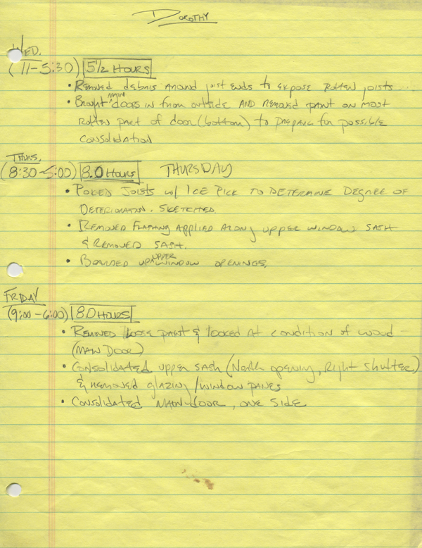 Each morning, photographs from the day before were selected, captioned and installed in a three-ring binder along with the documentation, drawings (existing conditions or solutions considered/used), and any correspondence or faxes, as well as a treatment report for the day outlining what had been accomplished.