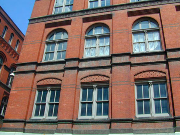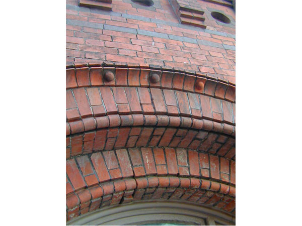 The Auditors Building, built in 1879, sits at the edge of the National Mall in Washington D.C. The strong impact, typical of the Victorian Gothic style, was created through the juxtaposition of the black mortar joints against the red bricks, darker bands of brown sandstone, decorative terra cotta, and the painted woodwork. The facade is a dramatic play of material, textures and colors, having distinctive tight joints pointed with heavily-pigmented black mortar.