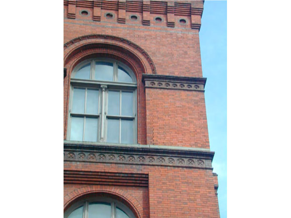 It was clear that failing mortar was to blame for the loose brickwork, but we need to discern the cause of the mortar failure. We examined a mortar sample and found that the deficiency was a result of the amount of pigment loading required to achieve such a strong black. During the construction era of these buildings, carbon black was commonly used as a pigment. These pigments tend to be much less stable than the iron oxide pigments we use today. This skewed the binder to cement ratio and caused the pigment and lime to separate too easily. The skyward facing joints had been subjected to significant water intrusion, which caused the already compromised mortar to suffer frost-jacking damage and to wash out onto the brickwork below. Despite the mortar's inherent deficiency, our findings showed that a surprising amount of original mortar could be saved, there fore reducing the scope and cost of the project. For the areas that had eroded or washed out we could create a replica mortar that was visually identical, but more durable than the original.