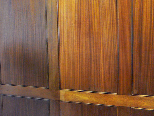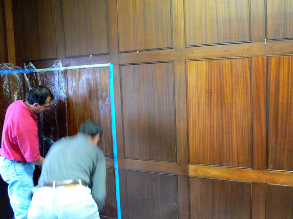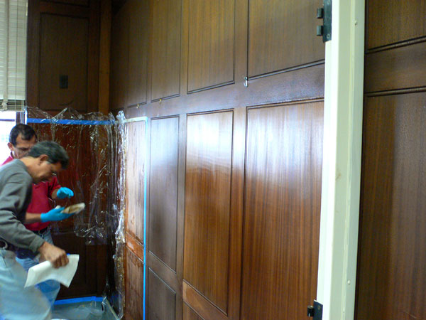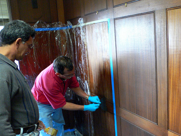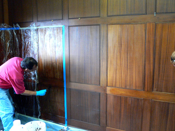 GSA now wanted the rooms refinished, but the conservation team countered that it might be more practical to just remove the recent finish, leaving either the original nitrocellulose as the presentation surface, or using it as a sound surface for the application of a new finish. Stripping rooms back to bare wood requires significant surface preparation and re-sealing of the wood that is unnecessary if there is an earlier sound layer. We sought to bypass these extra steps and work with the original surface, which would cause considerably less disruption in the rooms and would be more cost effective for the government.