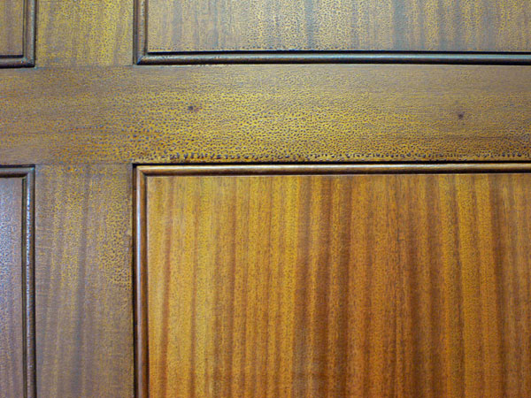 IRS Headquarters in DC was constructed in the 1930s and many of the rooms are paneled in mahogany with nitrocellulose lacquers. Sometime in the last few years an attempt to "spruce up" the rooms with an overcoating of dyed varnish went wrong. The finish had separated into islands of pigment, causing a spotted leopard appearance. This was likely the result of adding too much dryer to the varnish in an attempt to speed the drying to within a few hours so the work could be completed overnight or in a weekend as is often required on occupied buildings.
