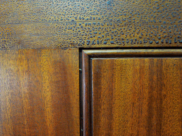 Ethanol was the appropriate for this oleo-resinous varnish (although it had to be used with care because too much dwell time could affect the underlying lacquer). The ethanol was gelled in Carboset and Ethomeen using formulations developed by Richard Wolbers. Troweled on, covered with plastic, and allowed to dwell 45 minutes, the varnish was swollen enough that it could be easily lifted off with plastic spatulas, although scotchbrite pads were used to gently lift it out of molding profiles. The surface was wiped down one last time to lift any residue using cotton rags touched with a bit more alcohol. After all the varnish was removed, GSA found they liked the original nitrocellulose layers and chose to simply have some dark wax buffed into the moldings to give a bit more warmth and depth to the presentation, instead of adding another finish on top.