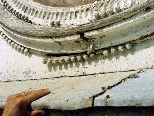 When the house was constructed in the 1760s the front portico was most likely adorned with a carved cartouche window that was replaced just before the turn of the nineteenth century by a more modern Neoclassical design. These windows are each unique, created by a craftsman with a particular set of skills at a particular place in time when certain trade practices were in vogue. While there are many oval windows like this on buildings throughout the country, they are all different in construction. They tell us about the capabilities and the understanding of the craftsmen, from the types of tools they worked with to the ways they solved problems. The materials, joinery, and details of the millwork on this 18th century building, although tattered and weathered, were as sophisticated in design and execution as the elaborate period furniture in the house. With that in mind, we strove to save as much of the original material as possible.