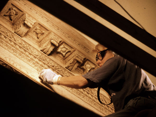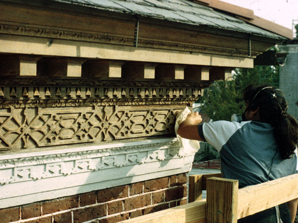 This project was designed to use local labor for repair of the forty-plus double-hung sash windows, as well as stripping and repair of most of the exterior woodwork, but we found no local contractors equipped with the skills required to conduct comprehensive repairs. The client was forward-thinking enough to agree that it would be best to train local people so the skills would exist in the local market. A sort of "crafts collective" was organized by choosing people with an expressed interest in learning new skills working under the direction of the conservation team. These individuals included both jack-of-all-trades craftsmen and women with no experience in working with their hands. (Patience and a willingness to learn is often more important for training someone in preservation skills than any prior construction experience.)