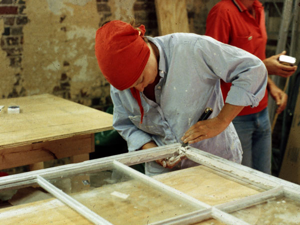 By starting with window repair in an on-site workspace, the team was sensitized to historic preservation and the tools of the trade that would prepare them for work on other parts of the building, while allowing us to assess each individual's suitability for particular tasks. Once the core group was trained, we paired them up with new team members to pass on what they had learned, thereby reducing the cost of the training budget. We designed a semi-mass production workflow within the carriage house that allowed work to proceed in discreet batches with a variety of workstations dedicated to specific stages in the repair process.