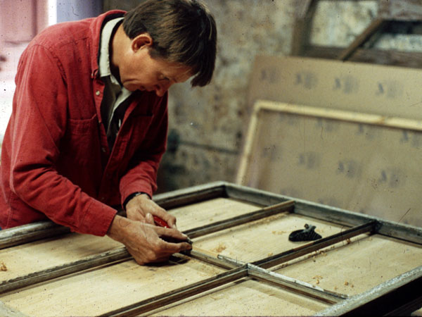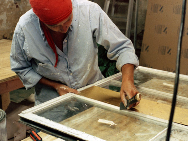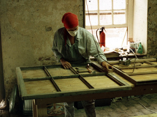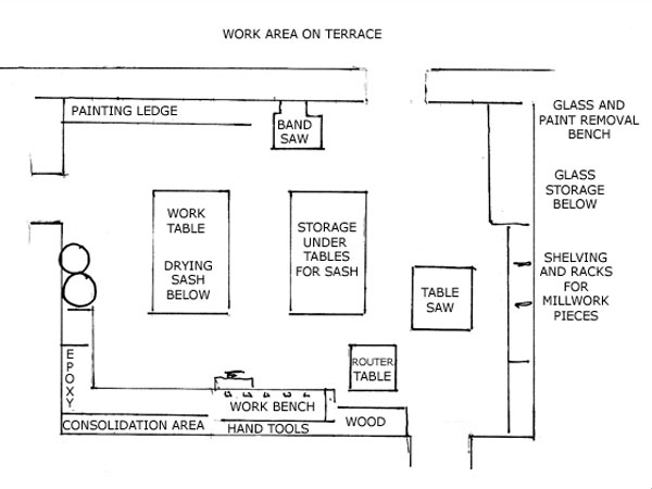 We repaired the first few windows ourselves so that Linda, the foreman, and Tom, the general contractor, understood the process. I worked with Tommy and Linda each day on every aspect of window repair: removing paint, removing glass, consolidating damaged areas, making new pieces of molding. Gradually we laid out the shop, built the accessories and work tables, and assembled the necessary tools and supplies.