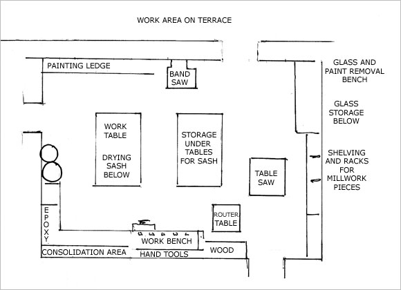 The shop had two central tables and work benches along the walls. Every table had a large surface to work on and storage built underneath. When sash arrived at the shop, they would first go to a work table where they would stand up or lay out flat, where both paint removal and the unpleasant task of heating the putty and carefully taking the glass out took place. The glass was numbered for each sash and stored in a numbered storage area on the wall. In this way, we kept the lead and dust paint table away from the rest of the room.