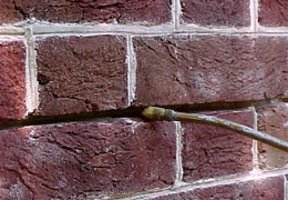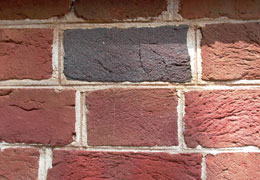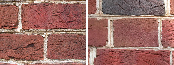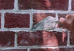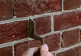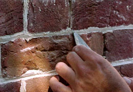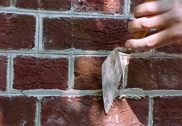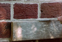 10. Once the surface has begun to carbonate and the brick faces are completely dry, it's time to weather the joint. Brush the bricks free of any loose bits of mortar and tap the joint faces vigorously at the diagonal with a stiff brush (preferably a churn brush) to expose the aggregate. About a week later, wet the joints and apply a mild vinegar bath, followed by a brushed-on application of "dirty" pigments to imitate the build-up of dirt. |