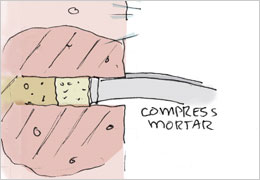 4. We lay lifts of bedding mortar in at 1/2" deep intervals, then wait from 30 minutes to several hours (depending on the weather) until much of the free water has been drawn into the surrounding masonry. At that point we return to beat or compact the mortar. This ensures a dense mortar free of voids. |