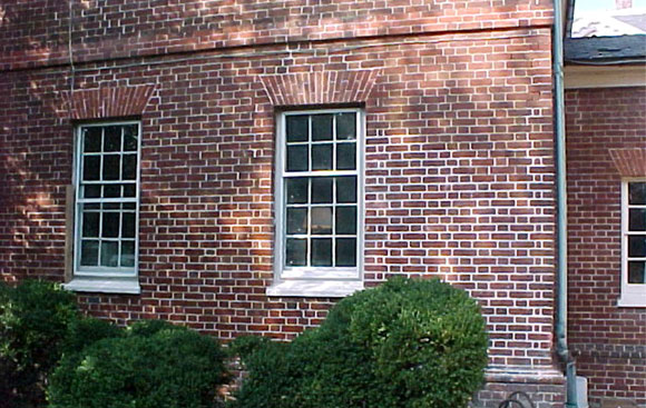 First, carefully inspect the mortar joints throughout the house and note differences in types of original mortar, workmanship, and tooling at different places on the main block (particularly between front and back facades and the sides, as well as above the belt courses). Even more variation may be visible on the hyphen and wings. Next, examine the weathering that has taken place. At right is an original and largely pristine protected joint from the Hammond Harwood House. Clearly this joint was originally cut downward to expose the aris below while a thin smear of pointing mortar rode onto the brick above. In the intervening years, the exposed areas of the building have weathered, and the joints have aged principally from acidic rainwater cutting back the mortar at both top and bottom arises. The replication must mimic this weathering.